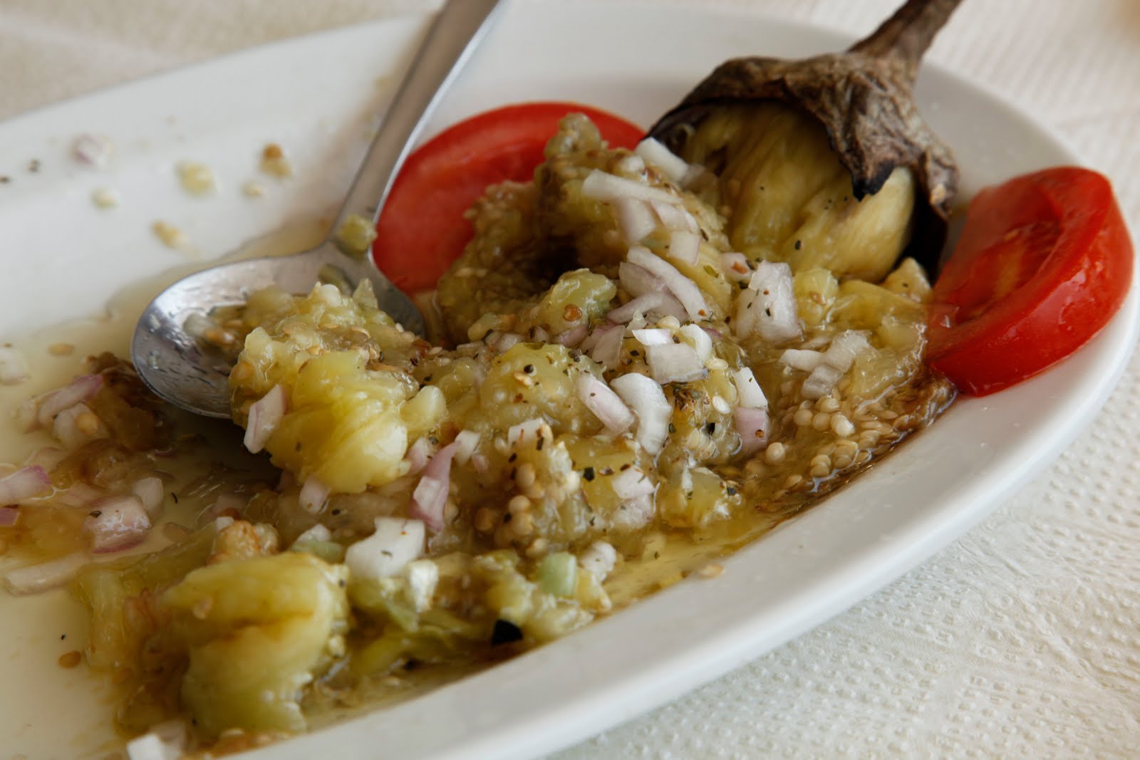 Next came a dish Niko claims is his signature dish. It’s called egglpant salad but I find the Greeks use the word salad where we would use the word dip, sauce or salsa. The eggplant dish was like an eggplant salsa with garlic, vinegar and onions. It was charred on the barbecue so it had smoky flavours to add to its dimension. This is the most amazing way to eat eggplant I’ve ever tasted – wow!