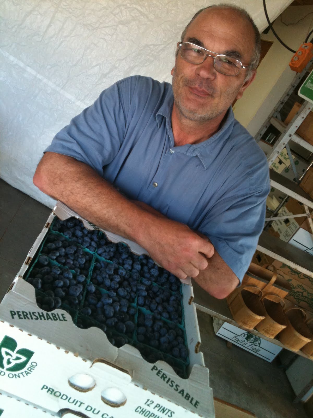 Today I’m shopping for the market with Cheryl and our first stop is at Pleasant Berry Blueberry Farm in Brantford. Tony and Grace Gdyczynski run the 2.5 blueberry patch. He’s been growing blueberries for too long, he thinks 16 to 17 years. I have refrigerator of blueberries at home and I can’t resist buying more, They’re ultra sweet and bursting with blueberry flavor. It’s both a U-Pick as well as ready picked. It’s a very neat and pretty little patch. We load up Cheryl’s truck with blueberries before heading to the next farm.