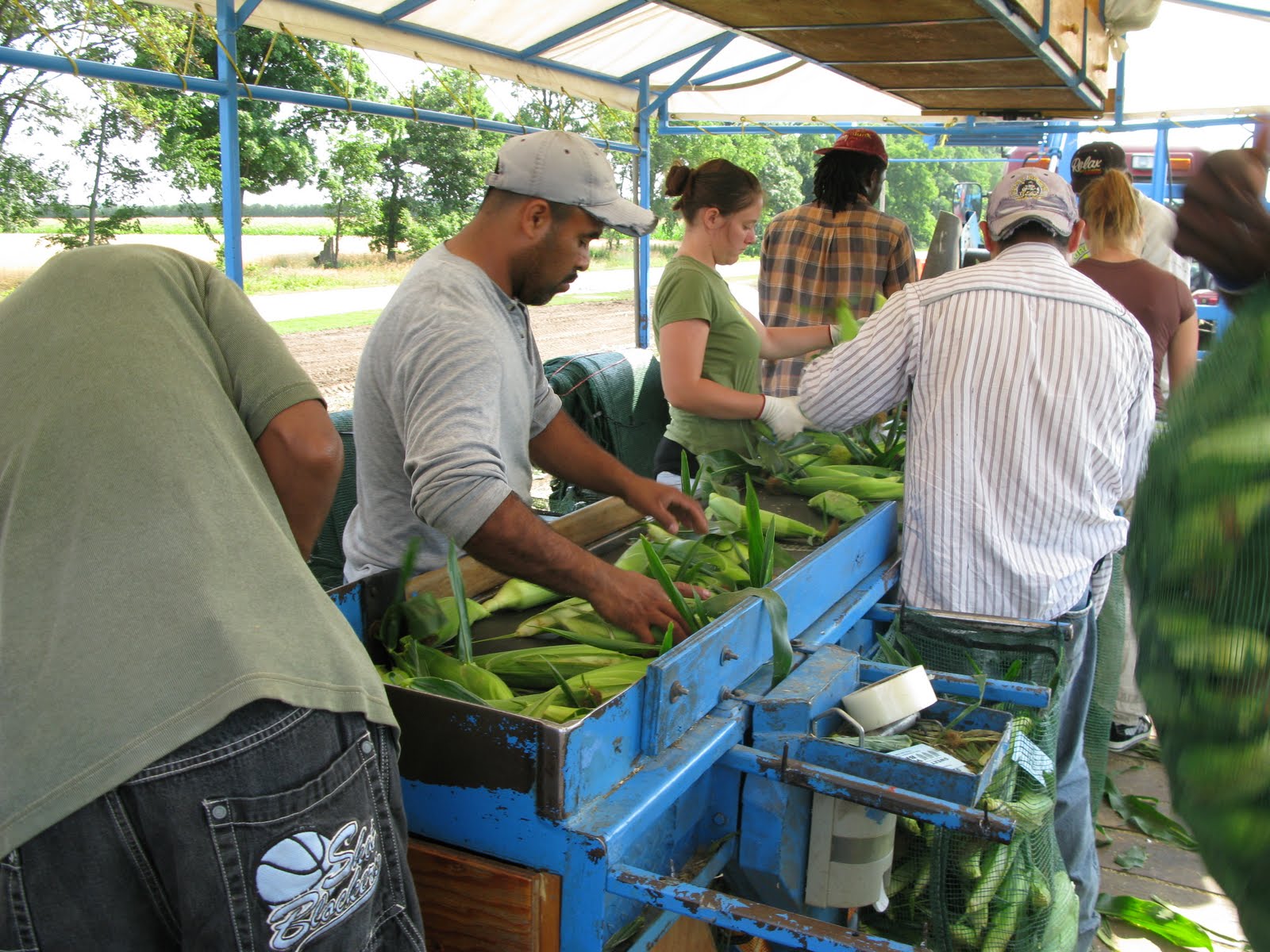 Out at the field, the picking machine is hard at work. We climb on board. Five to six workers pick furiously in the field and throw the corn into a suspended hopper that leads through the field. From the hopper a conveyor belt moves the corn to the sorting and packing line where another eight workers sort the corn and bag it. The bags are then piled high in a trailer that is pulled behind the sorting line.