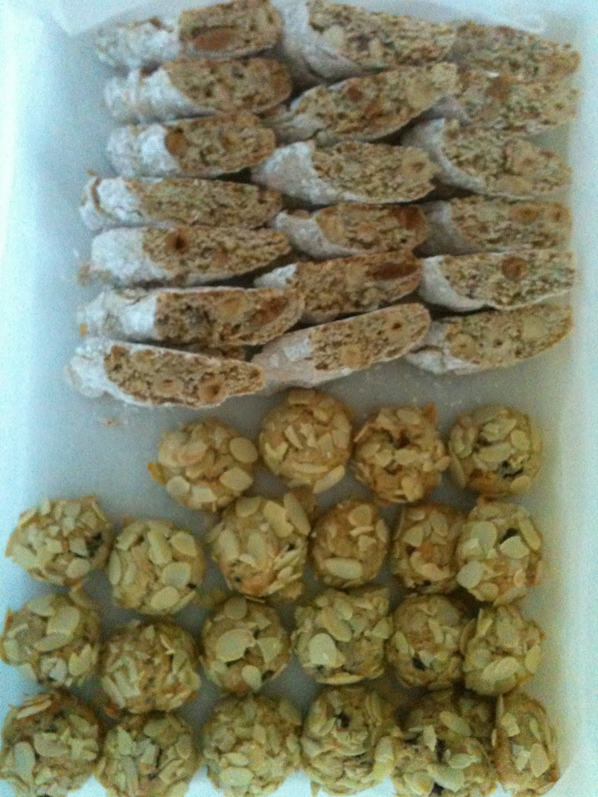 There’s too much flour in my bowl and the shortbread is way too crumbly. I work in more butter with my fingers and it becomes barely acceptable. Nothing seems to be working for me but the ladies are gracious. It’s now 5:30 and the count on the table is 300 cookies of one recipe, 360 of another, 250 of the almond balls and who knows what else – amazing. I’m producing just under 100 biscotti and 40 shortbread cookies – how underwhelming, aughhh.