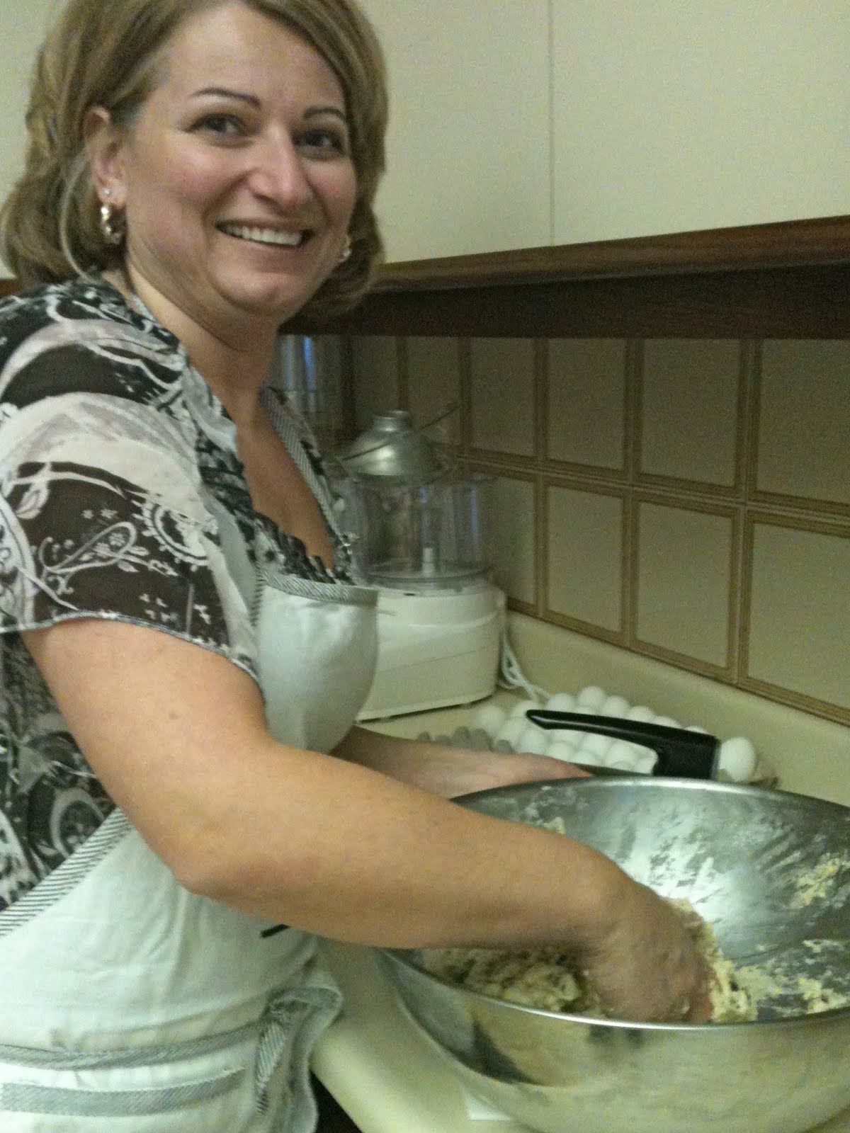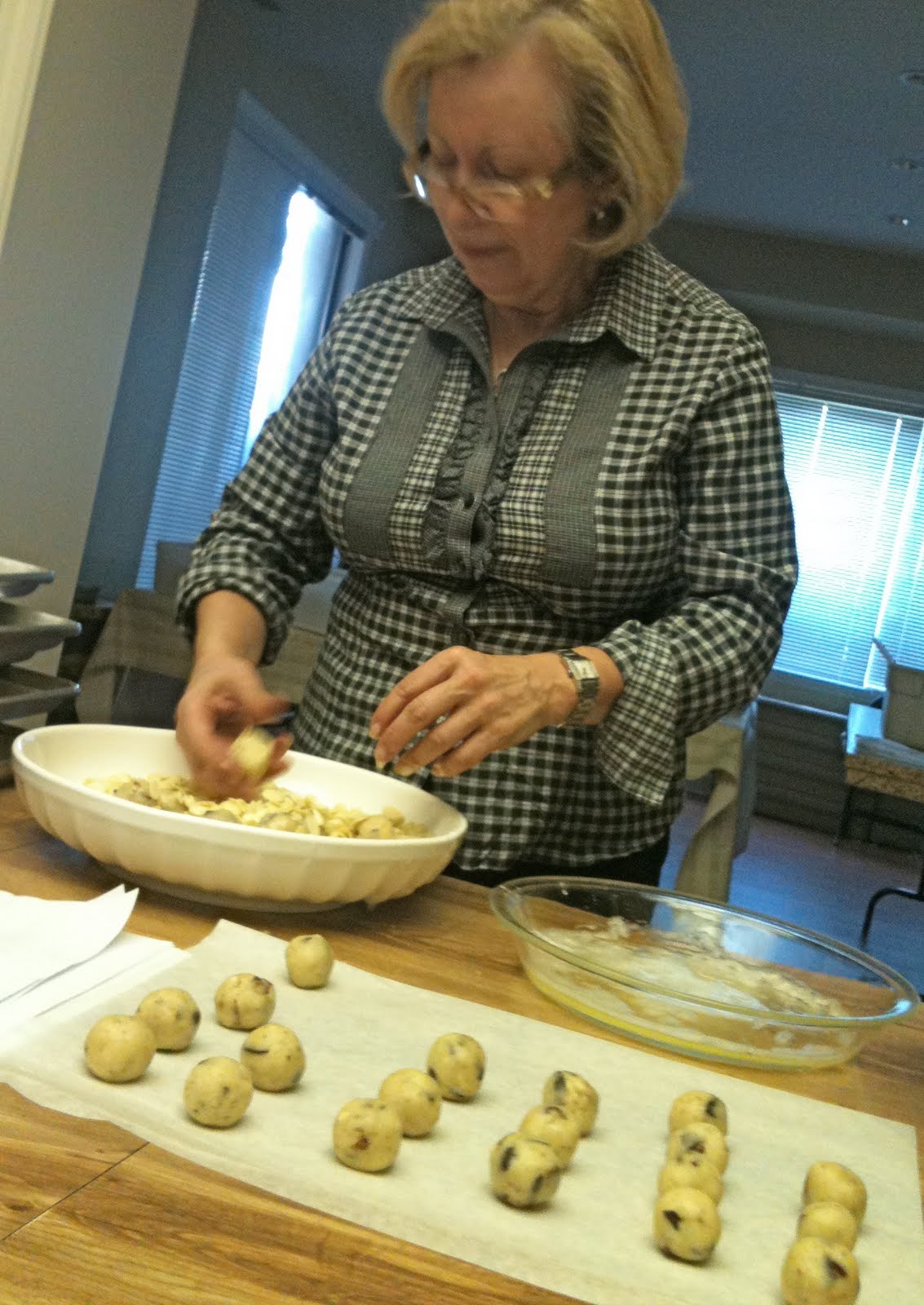 My biscotti are now out of the oven and I wait to cut them. Theresa’s cutting hers and they’re slicing perfectly. Mine are still warm when I attempt and the nuts and dried cranberries tear every second one – aughhhh. They get cut, turned on their sides and back into the oven for a second baking. I’m getting tired and frustrated, I’m usually a very good baker but in light of these women, I realize I’ve got a long way to go. Look out culinary schools, I don’t know of one that can hold a candle to this efficient production of Italian ladies baking their beloved holiday traditions.