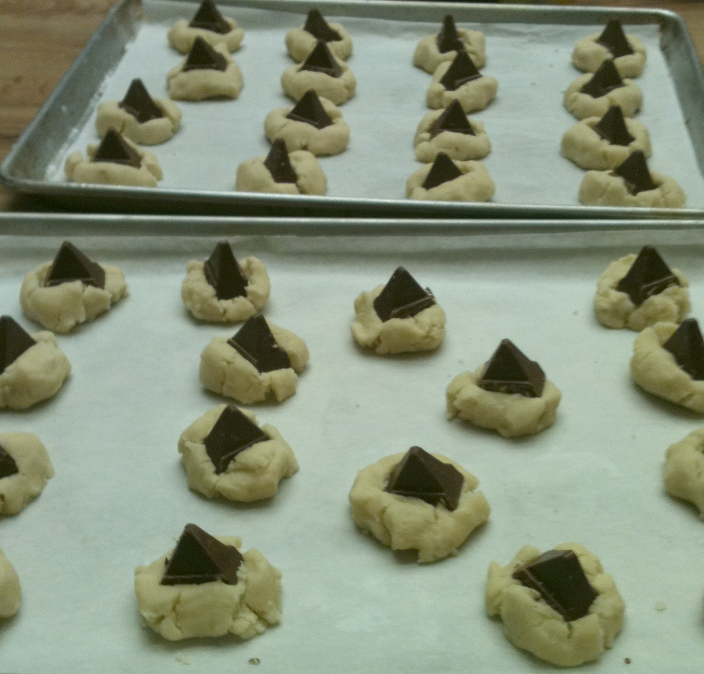 Theresa and Phyllis have their heads together as they work cinnamon and hazelnuts into the chocolate cookie dough. They taste it and Theresa decides to add orange zest and a bit of almond. Then with great satisfaction Theresa parades the kitchen for the rest of us to taste. With approvals all around she moves towards another stack of pristine cookie sheets.