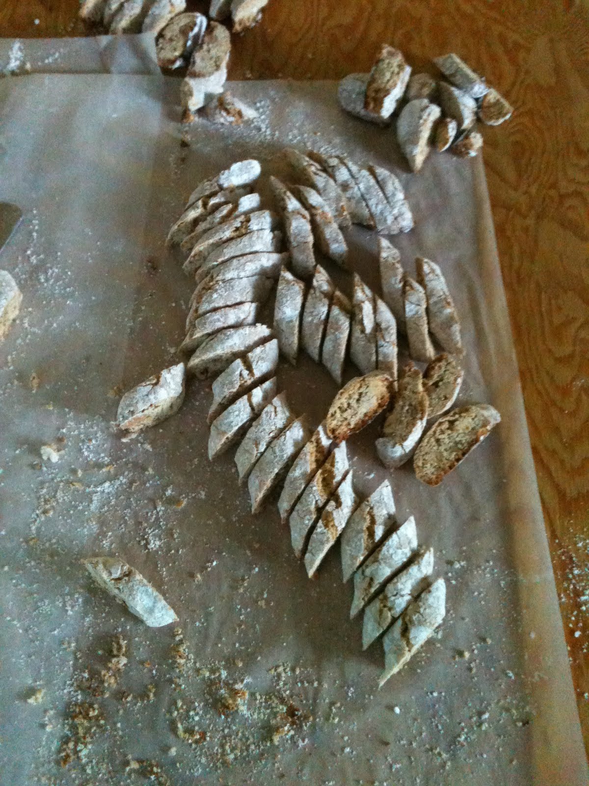 Anna leaves while Marissa and Lucy unload their bags and dive right into the kitchen with the energy of a new day. All of the new recipes are calculated for a double and triple batch. The group hovers around a cutting board filled with whole biscotti logs waiting to be cut. They decide that biscotti perfection is a combination of the right cutting board, a sharp knife, type of nut used and the perfect temperature of the cookie. There is an endless ritual of whispers, poking, cutting and discussing – perfection is always being worked on. I don’t think there has ever been as much thought gone into solving world problems as there is in this kitchen with these cookies that will be shared and eaten in the name of love and hospitality.