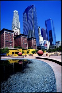 On our way we past a caravan of vans, trailers and busses, one of the many movie shoots happening in the city. There were over 200 movies shot on the streets of Los Angeles last year and CSI New York is almost exclusively shot on the streets of LA. We passed Fig and 7th, an intersection with giant steps that go down. It’s the site of a shopping centre that’s 5 floors below ground.