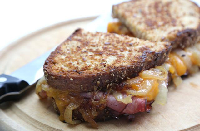 Corned Beef Grilled Cheese Sandwich with Sinister Sam’s Caramelized Onions