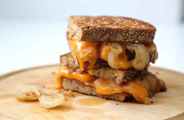 Think outside of the box with your next grilled cheese sandwich. Instead of one cheese, use a mix of old cheddar, jack, asiago and goat cheese. Now add some caramelized onions and strips of medium rare barbecued steak and layer it all between grilled slices of hearty Calabrese bread.