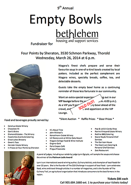 So what does all this have to do with soup? Well, Niagara potters made over 100 soup bowls so hungry soup lover could gather at the Four Points Sheraton Hotel in Thorold on Wednesday, March 26 to taste some pretty sensational soups made by chefs who were competing for the coveted Golden Ladle Award. The event is called Empty Bowls.
