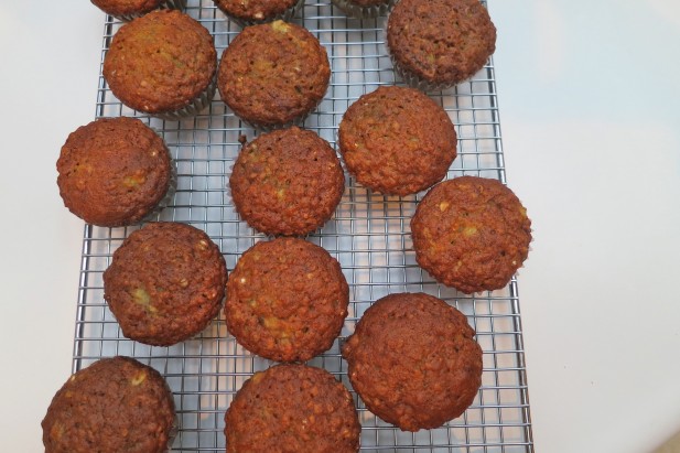 The recipe made 20 banana oatmeal muffins and right out of the oven, they were delicious. There was loads of rich, moist banana flavour and a density that sets muffins apart from cake. Open one up and lay a pat of butter in the centre and let it melt – yum!