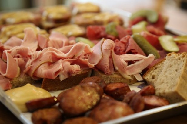 Out of the back comes a young man with a clean chefs jacket holding a large platter of meat. He offers it up to our group. The first sample was a slice of meatloaf on top of rustic sourdough and spread with spicy mustard. The loaf is rich with a peppery flavour that takes on the challenge of spicy mustard skillfully. It’s a full, robust mouthful. Next were warm, pieces of juicy, smoked Přeštice sausage named after the region it is known for. It filled your palate with powerful robust smoky-rich flavours, a burly character sure to warm in the cold weather.