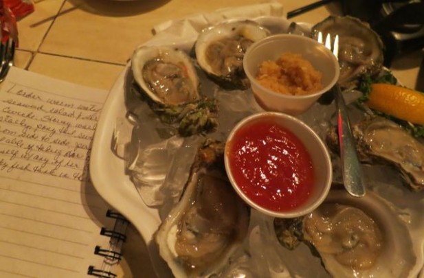 We’re presented with white, laminated menus that offer up no less than hundreds of dinner options from raw seafood selections to sushi, pasta and sautéed alligator. In spite of where we are, I remember the fishmonger next door and I begin to crave oysters. I ask our waitress about them. Her name is Stormy and she explains they’re Florida Apalachicola Bay oysters, warm water oysters. I’ve never heard of these before so I order them.